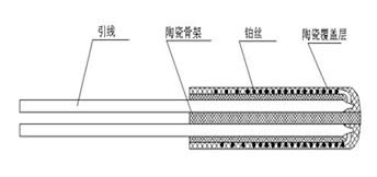 该铂电阻在结构上(如图)采用了引线在反端与电阻体烧结在一起,贯穿电阻体引出,引线与电阻体烧结处的陶瓷避开拉应力使引线坚固,电阻体与引线烧结处在外力作用下不至于开裂;另一方面的优点体现在铂丝绕在电阻体外表面且用陶瓷覆盖,烧为一体,使得该元件的反应速度快;由于铂丝分部在电阻体的外表面,有效散热面积大、皮薄“0.1mm”散热快,所以自热系数小;由于铂丝被约束在陶瓷的刚性体内故不怕振动,长期稳定性及寿命都好;又由于元件的烧结温度较高(800℃以上)铂丝的膨胀系数远大于陶瓷的膨胀系数,在烧结温度时铂丝取得最大的体积,随着温度的降低陶瓷固化在铂丝外围形成壳体,在使用温度范围内从微观上讲,铂丝属于工作在一丝一腔的无应力的自由状态。如元件通入较大的电流,只有铂丝加热体积膨胀后仍在壳体容积以内,不破坏壳体,元件的固有参数不变。这也是该型铂电阻能胜任热线式流量传感器的原因所在(参见热式流量传感器)。